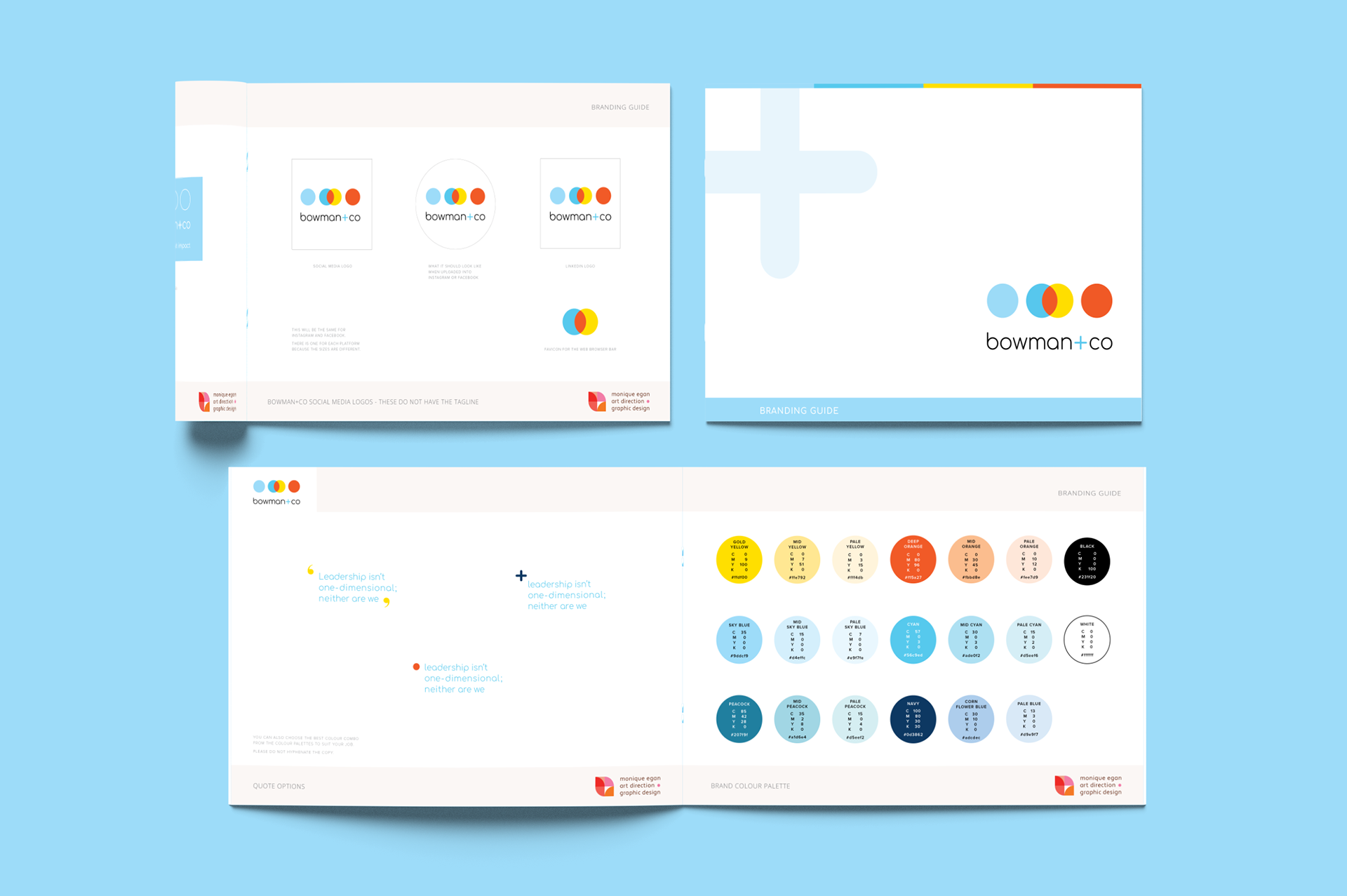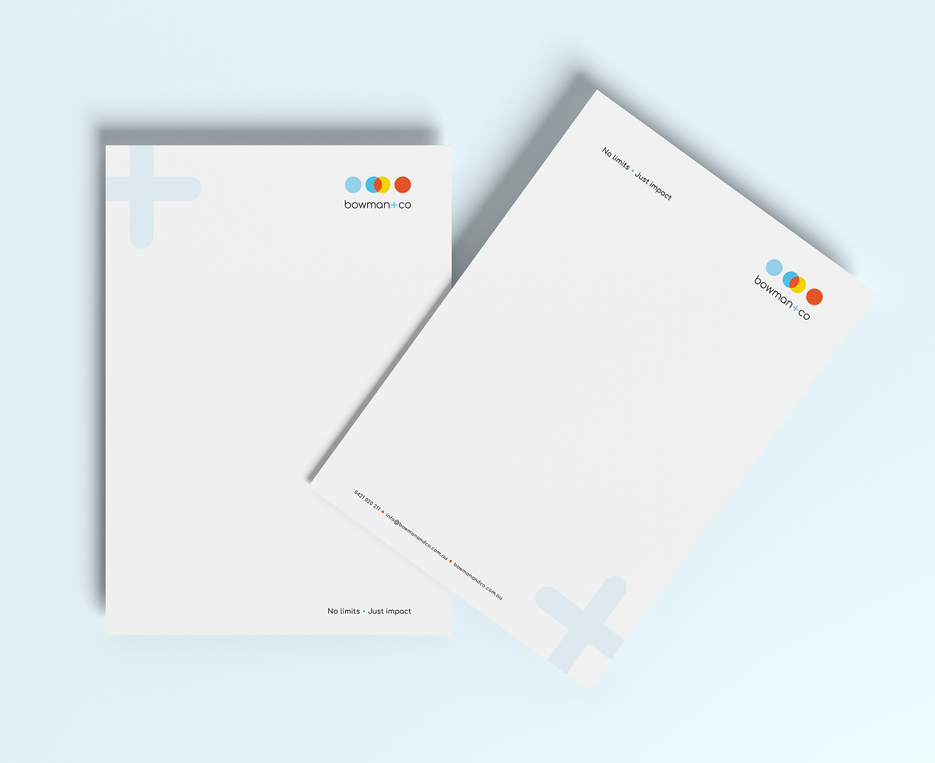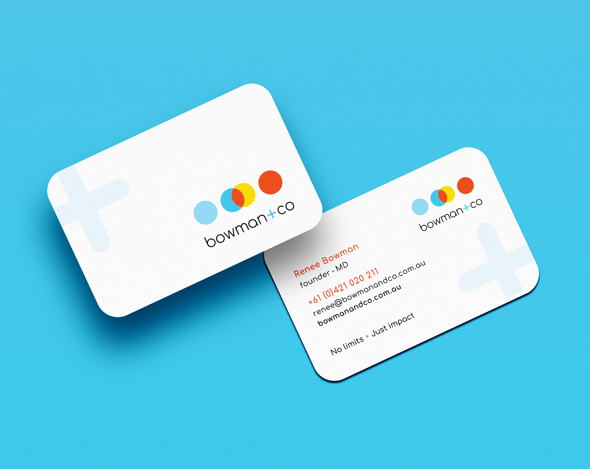 The goal was to align Bowman+Co’s brand with their high-end client base. The outcome, a clean, modern and confident design that balances professionalism with personality. The dots represent collaboration, movement and strength and the colours, fresh, bold and warm paired with white bring clarity and focus. The identity, developed from the logo, fonts and colour palette, was applied across stationery, icons and sub-brands.